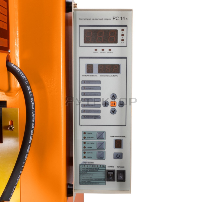 Машина оснащена сварочным контроллером высокой мощности. Встроенный контроллер позволяет устанавливать параметры, составлять и контролировать технологические программы сварки, обеспечивает сохранение технологических программ (позволяет растягивать по времени включение и выключение сварочного тока) и возможность оперативного их использования, при необходимости, с минимальным временем выбора. Машина оборудована специальным устройством, позволяющим контролировать силу сварочного тока в реальном масштабе времени работы оборудования. Возможен оперативный показ на мониторе количества сваренных точек (счётчик точек).