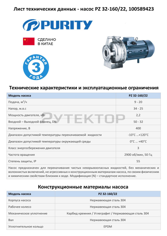Моноблочный насос из нержавеющей стали PURITY PZ 32-160/22 (N)