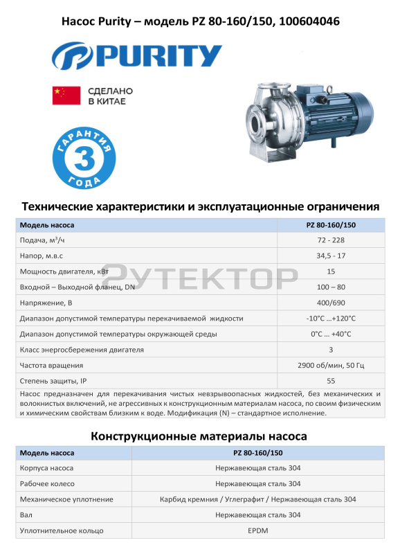 Моноблочный насос из нержавеющей стали PURITY PZ 80-160/150 (N)