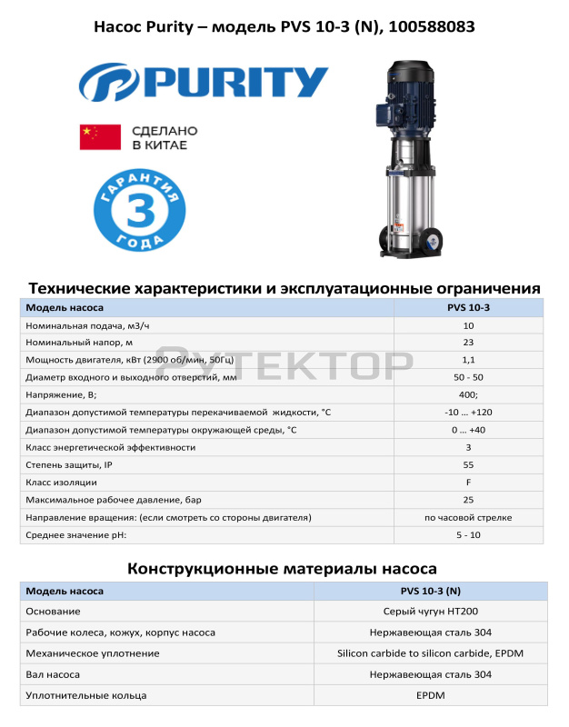 Вертикальный многоступенчатый насос PURITY PVS 10-3 (N)