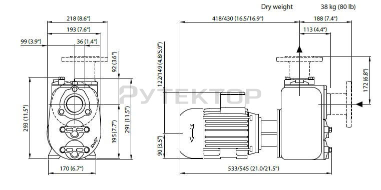 Самовсасывающий центробежный насос с рабочим колесом открытого типа, способен перекачивать жидкости с большим содержанием песка, грязи и твердых частиц. В зависимости от модели диаметр частиц может достигать до 76мм.