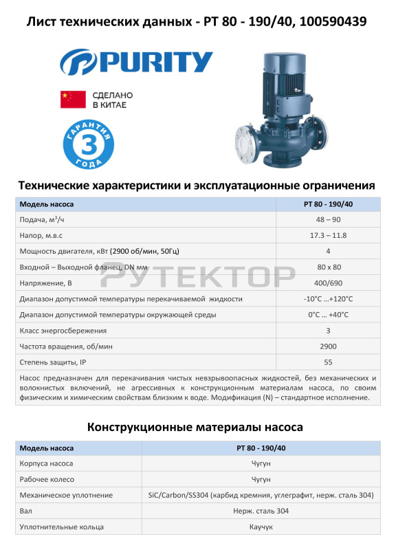 5 1 Насос моноблочный в линию PURITY PT 80-190/40 (N)